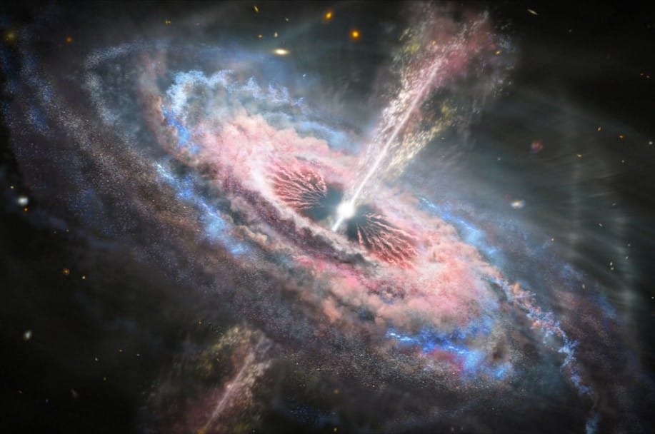 It’s not fully clear why jets shoot out of black holes, but think of it like what would happen if you sprayed a constant stream of water on a buzz saw spinning at maximum speed.